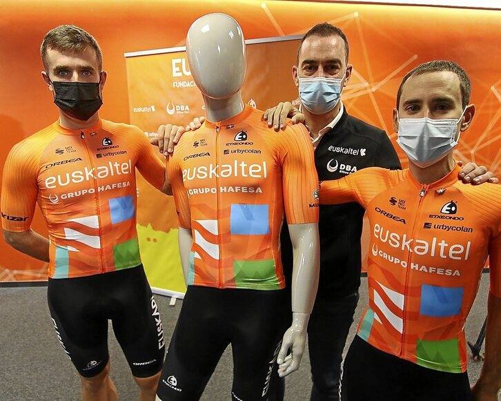 El Euskaltel-Euskadi presentó ayer en la sede de la empresa de telecomunicación vasca de Derio la equipación de Etxeondo que llevaran sus corredores la próxima temporada. Mikel Bizkarra y Mikel Aristi fueron los encargados de lucir por vez primera en público un maillot en el que predomina el naranja, aunque aparecen otros colores y el nombre del Grupo Hafesa como segundo patrocinador.