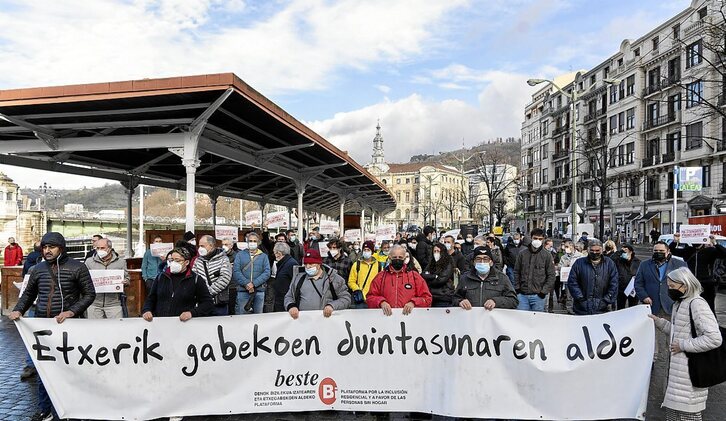 Una concentración convocada por la plataforma por la inclusión residencial y a favor de las personas sin hogar Beste Bi denunció ayer el reciente fallecimiento de una mujer sin hogar en Bilbo. La plataforma ha reivindicado un mayor compromiso de las instituciones en el desarrollo de políticas públicas que luchen contra la desigualdad.