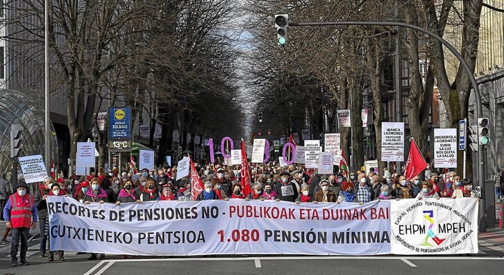 Miles y miles de pensionistas volvieron a salir ayer a la calle para reinvidicar unas pensiones dignas y, en un contexto actualizado, protestar por la reforma del sistema aprobada por el Parlamento español y por la subida anual decidida por el Gobierno de Pedro Sánchez en base a un cálculo del IPC «tramposo». En Bilbo, Iruñea y Lizarra se llevaron a cabo sendas manifestaciones, una convocatoria que se extendió por otras ciudades del Estado.