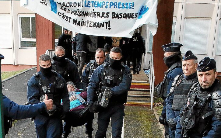 Estatuaren zerbitzu bat blokeatuz «agerian utzi nahi dugu bakebidearen aurka jokatzen delarik arazoak sortzen direla», azaldu zuten. Era berean, Emmanuel Macronen gobernuaren «utzikeria» eta terrorismoaren aurkako Fiskaltzaren «mendeku jarrera» jomugan jarri zituzten. Ion Kepa Parotek eta Jakes Esnalek baldintzapean aske geratzeko bideratu dituzten eskaeren gainean «berehalako erabaki baikorrak baizik ez ditugu onartuko», ohartarazi zuten.
