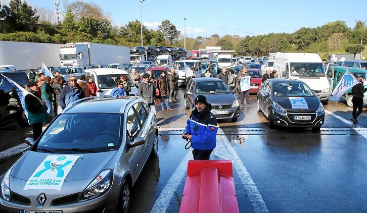 Tras las declaraciones a los medios de comunicación, de manera coordinada, unos 120 vehículos, repartidos entre Urruña y Hazparne, se ponían en ruta con destino a la principal arteria de comunicación: la A63.