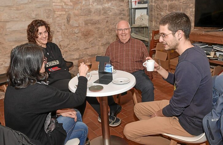 Tuterako alkate Alejandro Toqueroren arabera, Erriberako hirian ez da euskal hiztunik. Hori esan zion behintzat alkateak Madrilgo komunikabide bati. Horretan ere egiatik urrun ibili zen Toquero jauna. Izan ere, Tuteran badaude euskaraz aritzen diren herritarrak. Horietako batzuekin elkartu da GARA. AEK-k antolatzen dituen Mintzakide ekimeneko partaideengana jo dugu eta saio batera sartu gara. Herrerias kaleko Letras a la Taza kafetegi liburu dendan elkartzen dira astero mintzakideak elkarrekin euskaraz aritzeko. Jose Mari, Silvia, Aitor eta Esti dira gure anfitrioiak. Kafetxoa edo garagardoa hartu eta mahai baten inguruan elkartzen dira. Argazkilaria eta biok gertutik ahalik eta trabarik gutxien egiten saiatu gara.