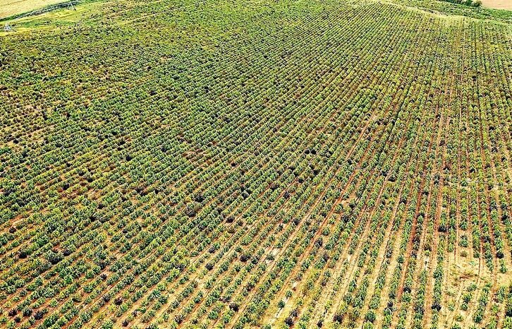 La plantación, repartida en 67 hectáreas al aire libre, el equivalente a casi 94 campos de fútbol, estaba situada entre Artaxoa y Erriberri. Siempre según estos cuerpos policiales, se han interceptado allí 415.000 plantas que suponen 87.500 kilos de cogollos y «que podrían venderse por 30 millones de euros para su conversión en otros productos, con valor final en mercado superior a 100 millones». Para poner en perspectiva el tamaño de esta plantación, dos datos: durante 2021 se incautaron en el Estado español 2,3 millones de plantas de marihuana y en 2019, en toda la UE, 3,7 millones. Es decir, lo incautado ayer en Nafarroa equivale a un 18,04% de todo lo incautado durante el año pasado en el Estado español o un 11,2% de lo encontrado en 2019 en el club europeo.