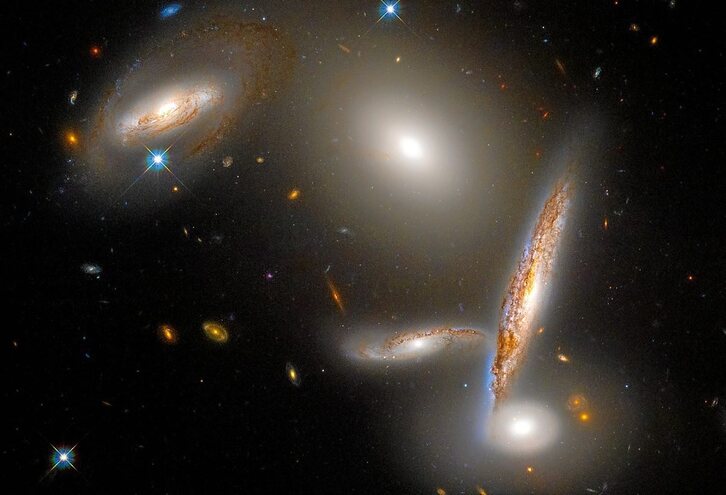 El Telescopio Espacial Hubble de la NASA/ESA celebra sus 32 años en funcionamiento con una mirada a una colección inusual de cinco galaxias muy unidas, llamada Grupo Compacto 40 de Hickson. Incluye tres galaxias en forma de espiral, elíptica y otra con forma de lente en un momento especial en sus vidas, cuando se unen antes de fusionarse. Aunque se han catalogado más de 100 de estos grupos, el 40 de Hickson es uno de los más densamente poblados.