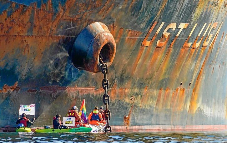 2017an, Ina Robles suhiltzaile getxoztarrak uko egin zion Bilboko portuan Arabia Saudira zihoan arma kargamentu bat zaintzeari. Errusiar inbasioa askoz presenteago dago bizitza politikoan Yemengo gerra baino, aldiz, ez du ematen ezkerrean gerraren kontrako sen aktibista piztu duenik. Irudian, Greenpeaceko kideak, herenegun, «Oil fuels war» lelopean errusiar petrolioa Norvegiara daraman ontzi batera kateatuta.