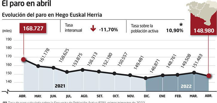 En el conjunto de Hego Euskal Herria hay 148.980 personas en paro según los datos correspondientes al mes de abril recogidos por el Servicio Público de Empleo Estatal (SEPE). De esta forma se rompe con la tendencia marcada en el primer trimestre del año, aunque esa cifra sigue siendo superior a la de diciembre pasado: 146.871. El descenso del paro es más marcado si se hace la comparación con abril de 2021, ya que hay 19.747 personas desempleadas menos.