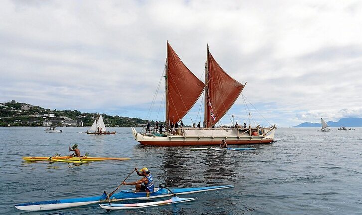 Polinesios en piragua escoltan a la tradicional piragua Hokule'a en su llegada a Papeete, isla de Tahiti, tres semanas después de haber zarpado de Hawái. Y lo hicieron sin ningún instrumento moderno de navegación, usando solo las estrellas, como hacían los ancestros en sus largos viajes, que les llevó hasta el continente antártico.