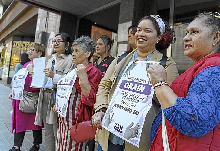 ‘‘Hitzarmena orain. Trabajadoras del hogar en lucha. Convenio ya!” zioten afixak eskuartean hartuta elkartu ziren atzo Bilbon, Lan Harremanen Kontseiluaren aurrean, etxeko langileak. Barruan, hitzarmen kolektiboa izan dezaten negoziazio mahaia irekitzeko eskaera erregistratu zuen LAB sindikatuak.