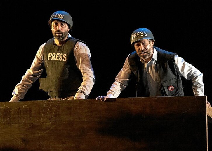 Zornotzako aretoan maiatzaren 21ean gaztelaniaz eta 23an euskaraz estreinatuko da. Lehen eszenan, taularen gainean bi aktore, Mikel Losada eta Aitor Fernandino, XIX. mendetik gure herriak ezagutu dituen gerretako jantziez inguratuta: karlistak, liberalak, gudariak... Lehen eszena horretan, kazetarien txalekoak eta kaskoak daramatzate: «Esango nuke denbora luzeagoa eman dugula gerran bakean baino; esango nuke bake bakoitza gerra zibil baten ataria baino ez dela», diote.
