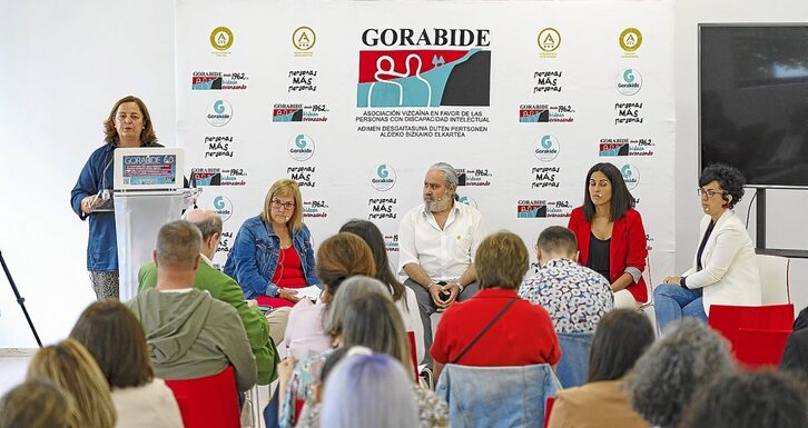 Garbiñe Egia Gorabideko erabiltzaileak aurkeztu eta gidatu zuen erakundeko profesionalen arteko solasaldia. Babes pisu batean bizi da eta Lantegi Batuak-en egiten du lan. «Beti egon zarete hor, eta ongi sentiarazi gaituzue», eskertu zituen.