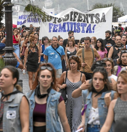 Aste Nagusian izandako eraso matxisten kontrako protesta gailendu zitzaion atzo festa donostiarrari une batez. Piratek deitu zuten kalera irtetera, eta argiak izan ziren baliatu zuten leloan: “Ziztadarik ez! Baboseorik ez! Gure gorputzei erasorik ez! Erasorik ez erantzunik gabe!”. Autodefentsa feminista aktibatu bai, baina alarmismorik gabeko mezua transmititu dute azken egunetan, egoera «larria» den arren, «alarma sozialean» ez erortzera deituz. Manifestazioaren amaieran, datozen jaietarako asmoa berretsi zuten Piratek: «Jarraituko dugu erasorik gabeko jaien alde lanean, edozer baitugu posible Donostia Piratan!». Jon URBE | FOKU