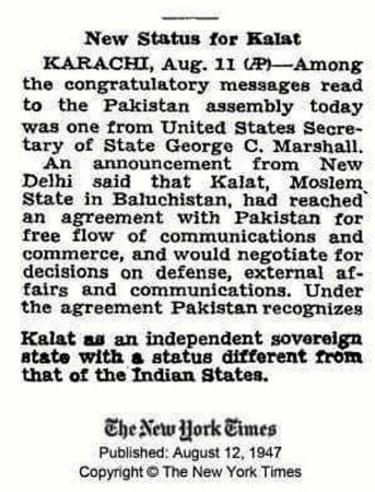 Cuando se cumplen 75 años de la fundación de Pakistán, los baluches recuerdan que ya habían declarado su independencia y disfrutado de un Estado propio antes de ser ocupados por Islamabad. Fue en una barbería al oeste de Londres durante la primavera de 2009. Colgando dentro de un marco sobre la pared, una noticia amarilleada recortada del The New York Times informaba de que Kalat (el antiguo reino que corresponde aproximadamente a la actual provincia pakistaní de Baluchistán) era un «Estado independiente y soberano desde el 12 de agosto de 1947».