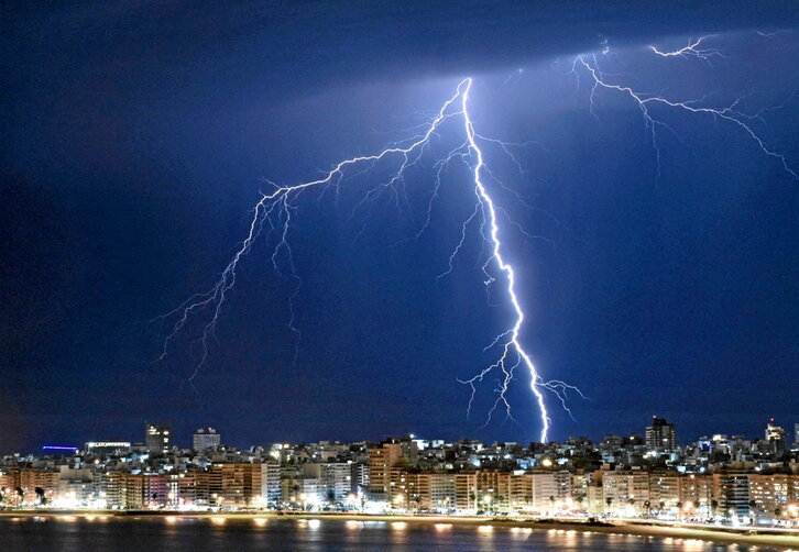 Las contradición en plena ebullición, las cargas negativas entran en contacto con las cargas positivas, electrones contra protones, espectáculo de una tormenta en el cielo oscuro de Montevideo (Uruguay), puesto en escena con el brillante destello de un relámpago. Ese relámpago causa el trueno que con su descarga de electricidad puede calentar el aire a su alrededor a 30.000°C, lo que hace que el aire se expanda explosivamente rápido. La onda de choque se hace onda de sonido en auge, trueno, y ya nadie puede impedir... ¡la lluvia!.