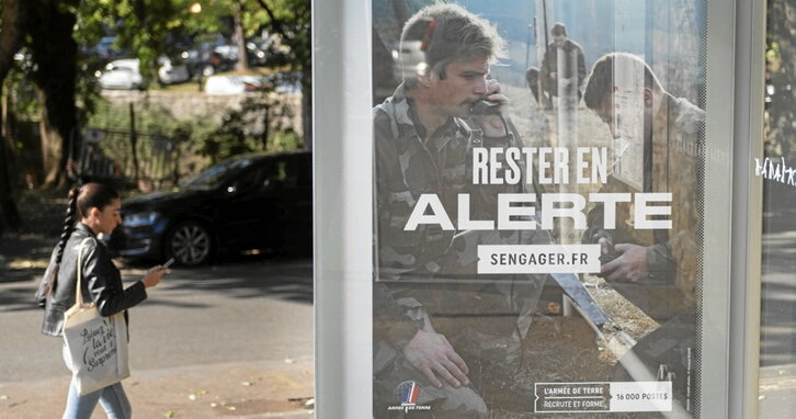 Estatuek mendeko herriak asimilatzeko eskura dituzten tresnak erabiltzen dituzte eta norbaiti Ukrainako gerra testuinguru egokia iruditu zaio Armada frantsesean izena emateko kanpaina egiteko. Ideiak ez du soilik Ipar Euskal Herriko abertzaleekin talka egingo: AEBen ildotik aldentzeko ezgai, eta krisi ekonomiko latzaren atarian, NATOren parte diren estatuek gastu militarra areagotzea iragarri dute. EBko agintariek gerraren aldeko apustua egin dutelako amaituko da «oparotasunaren garaia». Irudian, kanpainako kartela Baionako autobus geltoki batean.