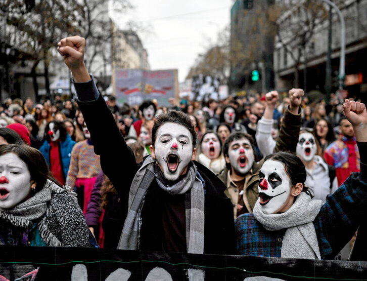 Miles de artistas volvieron a tomar ayer las calles en denuncia del decreto presidencial griego que degrada sus títulos académicos al nivel del Bachillerato. Las trabajadoras y profesionales del arte, que protagonizan distintas protestas desde hace más de un mes, señalan que el nuevo decreto empeora todavía más su reconocimiento y supone un retroceso en sus derechos. La equiparación significa, de hecho, la eliminación de la educación superior en Artes Escénicas en Grecia, primer país europeo en adoptar una decisión así. Angelos TZORTZINIS | AFP