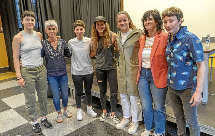 Empatía, trabajo, humildad, la fortaleza del equipo a base del trabajo colectivo... Son algunos de los valores que el deporte -tanto de élite como de base- les ha aportado a lo largo de su vida y, a partir de esa enseñanza, se han convertido -o están en el camino de convertirse- en referentes, aunque quizás ellas no sean conscientes. Nerea Pérez (patrona de Donostiarra), Ainhoa Artolazabal (ex ciclista), Eukene Larrarte (ciclista), Irene Caminos (trial), Nerea Eizagirre (futbolista de la Real) y Ane Lasa (fundadora de Aiztondo Nesken Kirol Taldea), todas ellas de Tolosaldea, compartieron ayer en la Casa de Cultura de Tolosa sus vivencias como deportistas junto a la expelotari Patri Espinar, que hizo a su vez de coordinadora de la mesa redonda.