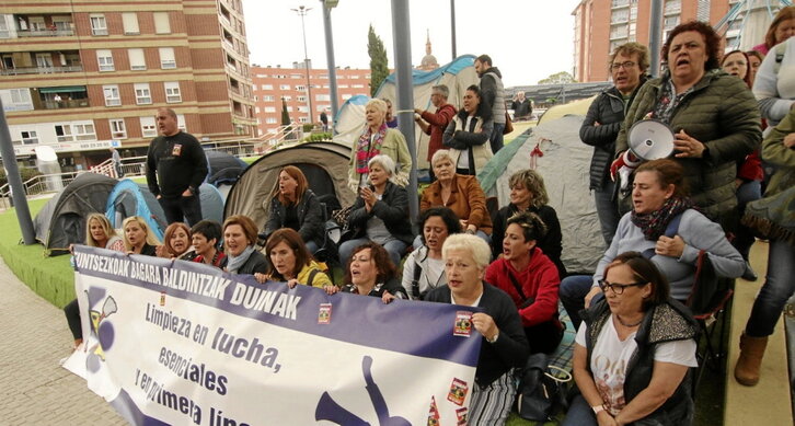 Las trabajadoras de las empresas adjudicatarias del servicio de limpieza de Osakidetza, que llevan acumulado más de mes y medio en huelga, dieron inicio ayer a una acampada frente al Hospital de Cruces en defensa del convenio y la homologación. Los sindicatos LAB, UGT, CCOO y ESK denunciaron que las empresas adjudicatarias y la dirección de Osakidetza «se echan la pelota unos a otros, mientras las trabajadoras del servicio de limpieza estamos siendo objeto de una auténtica injusticia que se está alargando innecesariamente».