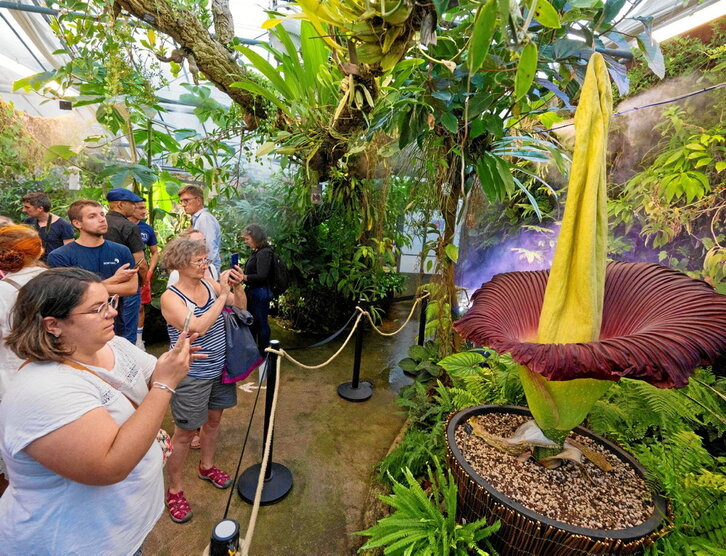 Se trata de un acontecimiento extremadamente raro y los visitantes del Jardín Botánico de Villers-lès-Nancy (en el noreste del Estado francés) solo han dispuesto de 72 horas para admirarlo: un aro gigante o, en la clasificación científica, Amorphophallus titanum -literalmente «falo amorfo titánico»- floreció la semana pasada por vez primera en 30 años, alcanzando una altura de 1,95 metros y un peso de 33 kilos. Está considerada como la flor más grande del mundo, y también la que peor huele: su otro apodo es la ‘flor del cadáver’ por su aroma a carne podrida.