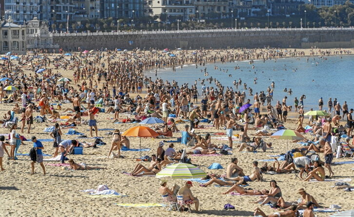 Imagen de la playa de la Concha, Donostia, ayer. Parece un fin de semana de julio o agosto. Y, ciertamente, es un fin de semana en el que en lugar del jersey, la zamarra y probablemente el chubasquero o el paraguas acostumbrados en esta época del año, donostiarras y visitantes optan por el bañador y la sombrilla para pasar un agradable día de playa. No se trata, en cualquier caso, de un ocasional regalo meteorológico en pleno octubre, sino de una confirmación más de lo que ya solo se puede denominar desastre climático.