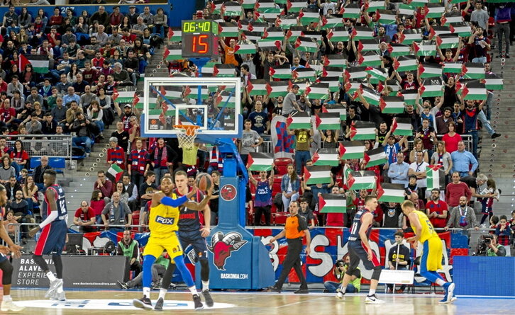 Urriaren 7az geroztik, Europako zenbait estatutan bandera palestinarra erakusteak isuna edo atxiloketa ekar dezake. Estatu espainoleko futbol zelaietan ere bai. Izan ere, La Liga erakunde pribatuak ikurra erakustea debekatu du. Igandean, Ipuruan, Israel-Eibar peñak bere pankarta askatasun osoz erakusten zuen bitartean, Ertzaintzak ikusle bat zelaitik bota zuen palestinar herriaren bandera erakusteagatik, eta isuna jarriko dio. Onartezina da. Maccabik Gasteizen jokatzen duenean, Palestinako banderak ateratzen dituzte zaleek. Zergatik ez?