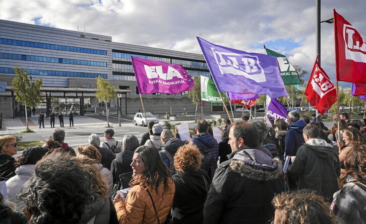 ELA, LAB, CCOO, Satse, Steilas eta ESK-k elkarretaratzea egin zuten atzo Funtzio Publikoko Mahai Nagusiaren aurrean. Sindikatuek Lakuari aurpegiratu zioten urriaren 25ean mobilizatu ziren langile publikoen eskakizunei entzungor egiten diela. «Orokortasunei buruz hitz egitea» leporatu zioten eta abenduaren 19rako deituta dagoen grebari eutsiko diotela esan zuten. Salatzekoa da beren eskubideen alde borrokan ari diren langileekiko (kasu honetan, funtzionarioekiko) Lakua erakusten ari den ardura falta.