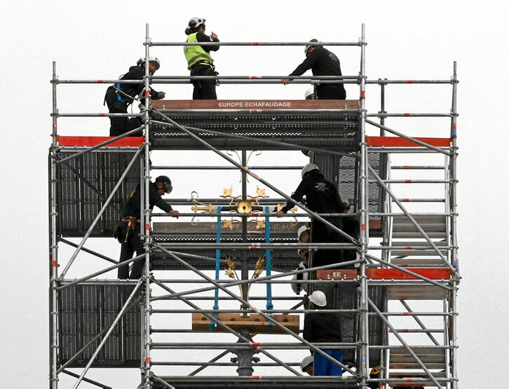 La nueva aguja de la catedral de Notre Dame, icono de este célebre monumento que quedó reducida a cenizas en el incendio de abril de 2019, comienza a tomar forma. Un aparatoso andamio se eleva en el crucero del templo, dentro del que se está levantando la aguja. En los primeros meses de 2024 están previstos los trabajos de recubrimiento de plomo y la instalación de seis pequeñas campanas, así como la colocación del gallo en la punta, de forma que la aguja sea idéntica a la destruida. Prevén que sea visible antes de la inauguración de los JJOO de París, el 26 de julio de 2024.