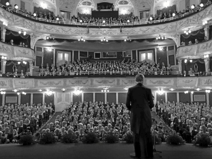 El título, tomado de la frase “Danza primero, piensa más tarde”, hace alusión a una cita del personaje Godot, pero sacada de su contexto irónico. Filmada en blanco y negro, la trama arranca en Estocolmo en 1969, durante la ceremonia en la que Beckett -interpretado por un excelente Gabriel Byrne- recibirá el Premio Nobel de Literatura. Sentado junto a su esposa Suzanne -interpretara por Sandrine Bonnaire-, murmura: «Qué catástrofe» -una opinión en realidad atribuida a ella-, y luego sube al escenario. En lugar de dar un discurso, sube una escalera que da a un vasto espacio cavernoso y entabla una conversación consigo mismo, encarnado por un Byrne vestido con su característica chaqueta de tweed.