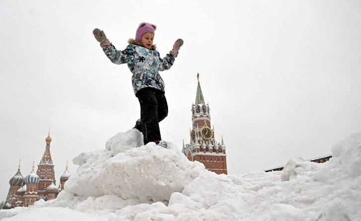 El ciclón "Vanya" ha desatado nevadas anormales en Rusia y en Moscú han alcanzado su nivel más alto en 150 años de historia de mediciones meteorológicas periódicas, con una altura sin precedentes de 50 cm. . La Plaza Roja está sorprendentemente viva de blanco. Convertida en decorado de cuento de hadas, los críos juegan sueltos y libres, los sueños frenéticos se desatan. Y es que, como ya se sabe, para soñar, el blanco, solo el blanco y siempre el blanco. Natalia KOLESNIKOVA | AFP