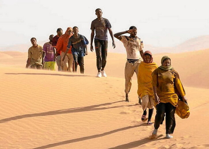 La película se convierte también en una “road movie” que muestra cómo las dificultades del camino transforman a los dos adolescentes. Una ruta en la que toparán con la extorsión institucionalizada, la violencia y el robo, los maltratos y la corrupción en las fronteras, las organizaciones dedicadas a estafar a quienes buscan escapar, las muertes en el desierto y la abducción en una cárcel no oficial en Libia creada por una mafia para exigir rescate a los familiares y vender a los sobrevivientes como mano de obra barata. A todo ello se suma la odisea dramática que supone cruzar el Mediterráneo.