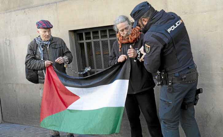 Palestinar herriaren eskubideen aldeko zenbait herritar Gobernu espainolak Iruñean duen ordezkaritzan kateatu ziren, BDZ dinamikak deitutako elkarretaratze baten testuinguruan. Berehalako su-etena eta Israelen kontrako zigorrak eta boikota eskatu zituzten, besteak beste, eta palestinar herriari elkartasuna adierazi zioten. Garbi dago orain arte egin dena baino gehiago behar dela genozidio sionista geldiarazteko. Txikitik handira, instituzioak eta enpresak konpromiso eraginkorrak hartzera eraman beharra dago.