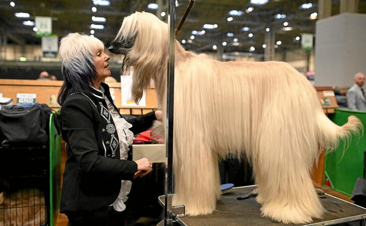 En Birminghamn, preparan a un lebrel afgano antes de ser juzgado en una competición canina. Prima la apariencia a la salud, hacer más brillante el pelaje, usar «inocuos» esprays, talco o tiza para ello. Se les exige tener glamour, ser lindos, se les trata como juguetes, dándoles nombres tontos o personalidades de Instagram. ¿Qué han hecho estos canes para ser tratados con productos que pican, que estresan, para ser encorsetados? Tratar así a un animal no les da un sentimiento de alegría, nunca es un regalo especial.