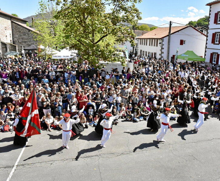 Desfilea Baigorriko Goiko plazara iristerako, tranpetan ziren bertan ehunka pertsona; batzuk merkatuko larruzko zapatilei, belarritakoei edo artilezko txanoei begira eta, beste batzuk, herriko ikastolan jarritako txosnan eztarria bustitzen. Baina aise inguratu zuten denak plaza, kasik bata bestearen gainean jarrita, emanaldia ikusteko.