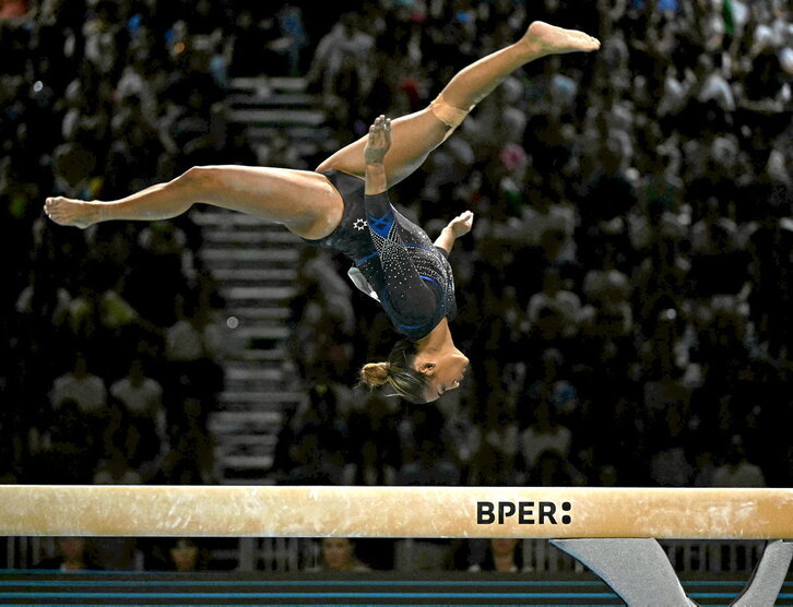 Beti aipatu izan da kirol munduan oso desorekatuta daudela kontuak. Gure artean beti jartzen dira adibide gisa futbola eta gainontzeko kirolak. Argazkian ikus daitekeena, gimnasia artistikoa, ordu mordoa eskaini behar zaion modalitatea da eta, kasu gehienetan, gutxi konpentsatua izaten da ekonomikoki eta, zergatik ez esan, sozialki. Marine Boyer frantsesa mundua beste ikuspegi batetik ikusiko balu bezala ageri da irudian. Egun hauetan Italian jokatu den Europako Txapelketa prestatzeko zenbat ordu igaro dituen ez du zenbatuta izango, baina bere emaitza, ederra, hortxe dago.