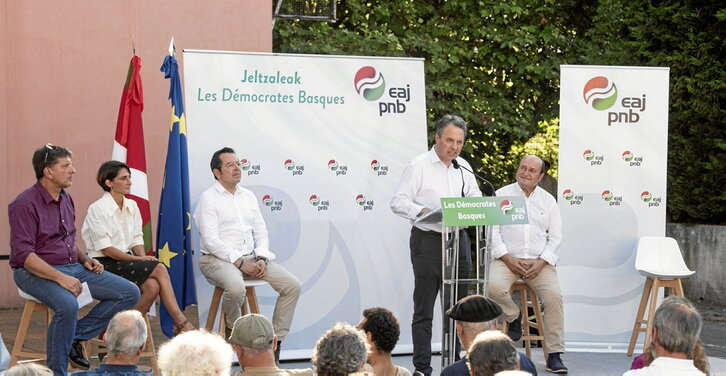 EAJ-PNB celebró, ayer tarde, en Uztaritze un acto público enmarcado en la campaña a las elecciones legislativas, que contó con el apoyo del presidente del EBB, Andoni Ortuzar. La formación jeltzale concurre en solitario a estos comicios con el objetivo de «llevar la voz de Euskadi a París». La última vez que se presentó a unas legislativas, en 2017, logró 2.151 votos (1,77%) en el conjunto de Ipar Euskal Herria.