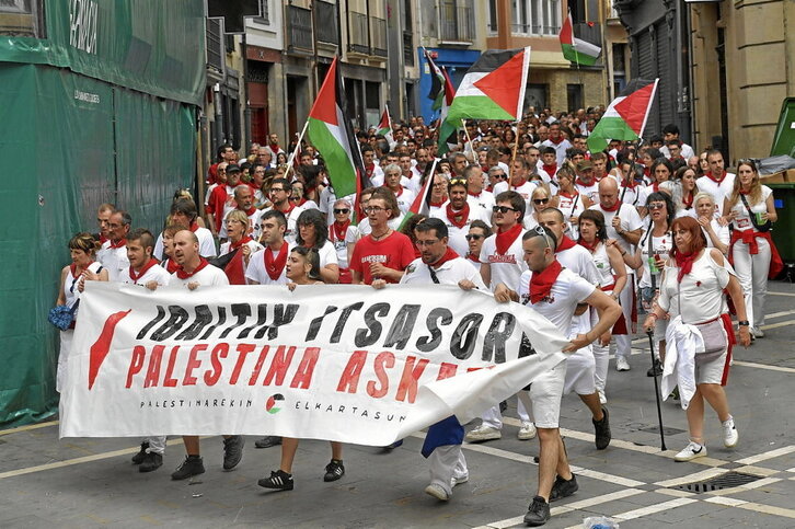 Palestinarekin Elkartasuna ekimenak deituta, ehunka lagun atera ziren kalejiran Iruñeko Sanferminen azken aurreko egunean, «Ibaitik itsasora Palestina askatu» oihukatuz, eta jai gune nagusiak zeharkatu zituzten, palestinar bandera handi baten atzean. Manifestari askok ikur bera eraman zuten eskuetan eta sionismoaren aurkako oihuak nagusitu ziren. Ez da lehenengoa izan; jai hauetan nonahi azaleratu dira herri palestinarra babesteko aldarriak eta ekintzak.