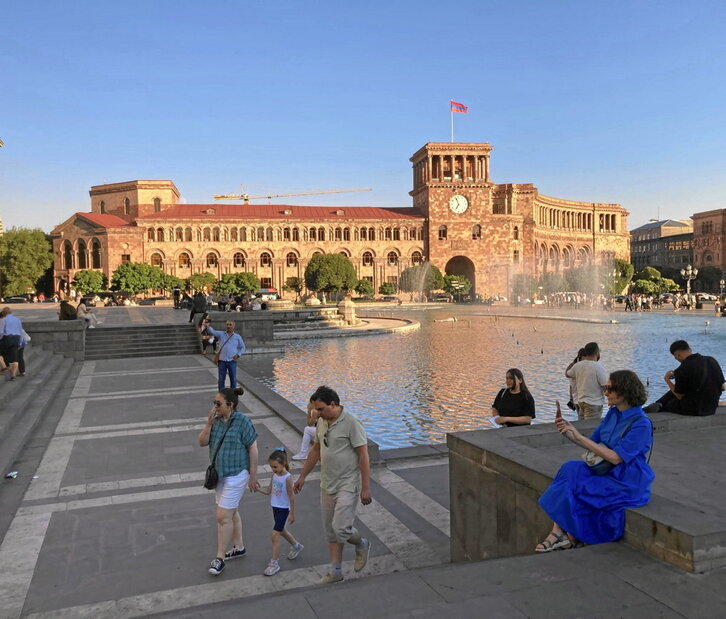 A un minuto a pie desde esos anuncios de excursiones a pueblos y ciudades hoy inaccesibles para un armenio está la plaza de la República. Es un lugar acogedor, sobre todo cuando sus edificios de piedra de tufa adoptan ese tono rosáceo al atardecer. Las familias se hacen fotos mientras esperan a que anochezca para disfrutar del espectáculo de luces y sonido en sus fuentes. Se puede disfrutar desde finales de abril hasta principios de octubre.
