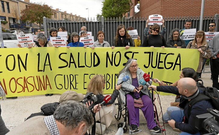 Maria Elena Escuderok garbiketaren arloan 40 urte lanean daramatza. Gaixotasun baten ondorioz, gurpil aulkian ibiltzen da. Bere lana egiteko gai ez dela agerikoa izan arren, Gizarte Segurantzak ez dio ezintasun iraunkorra onartu, eta Zaintzen enpresak Mendillorriko Mendigoiti ikastetxean lan egitera behartu du. Atzo bertaratu zen, baina ezintasunaren aurrean alde egin zuen, eta ordainsaririk gabeko kaleratzea ekar diezaioke. LAB sindikatuak elkarretaratzea egin zuen Escuderoren egoera salatzeko. Ulertezina da.