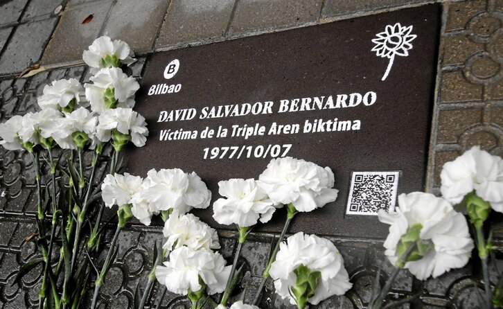 David Salvador Bernardo taxilariaren omenezko plaka jarri dute Bilbon. Andoainen hil zuen Triple Ak atzoko egunez 1977an, «Heriotzaren triangelua» delako gunean. Ekitaldian Juan Mari Aburto Bilboko alkateak, Bakearen eta Bizikidetzaren Aldeko Bilboko Topaguneko kideek eta Salvadorren senide eta gertukoek parte hartu zuten. Hernanin bizi bazen ere, Bilbon jaio zen David Salvador, Maiatzaren 2a kaleko 4. zenbakian, eta bertan jarri diote plaka.