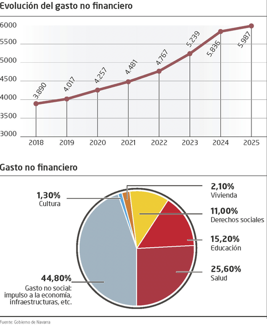 El Gobierno de Nafarroa aprobó ayer el anteproyecto de Presupuesto para 2025, en un contexto marcado por el regreso de reglas fiscales que restringen el gasto público. Las cuentas propuestas alcanzan un total de 6.431,3 millones de euros, de los cuales 5.986,6 millones se refieren al gasto no financiero. Es una cifra que supone un incremento del 2,6%.