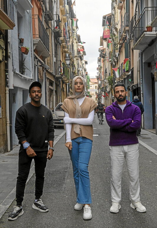 Un fugaz paseo por las calles de Iruñea es suficiente para conmover a estos tres artistas. Al doblar cada esquina, sus miradas se posan en las banderas palestinas que adornan los balcones, un recordatorio tangible de su hogar, Gaza. Rahaf Shamali, vocalista principal de Sol Band y la única mujer del grupo, captura las coloridas fachadas de Alde Zaharra con su teléfono móvil. Han pasado más de seis meses desde que logró salir del enclave; más de un año desde que el 7 de octubre cambiase su vida para siempre.