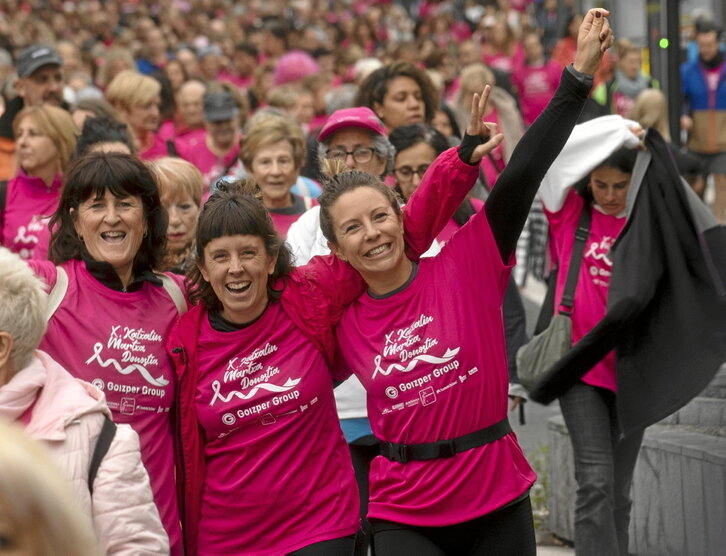 Milaka lagun jantzi ziren atzo Donostian arrosaz Katxalinen hamargarren Elkartasun Martxan, bularreko minbizia edo minbizia ginekologikoa ikusgai egin eta kirola eta bizimodu osasuntsua prebentzio faktore gisa aldarrikatzeko. Lau kilometro eta erdiko ibilbidea egin zuten, jai giroan, eta ez ziren falta izan erakundeetako ordezkariak. Bildutako dirua ikerketara bideratuko dute, Biogipuzkoa Institutura zehazki. Katxalin elkarteak emandako datuen arabera, 4.984 bularreko minbizi kasu diagnostikatu dituzte azken urtean EAEn.