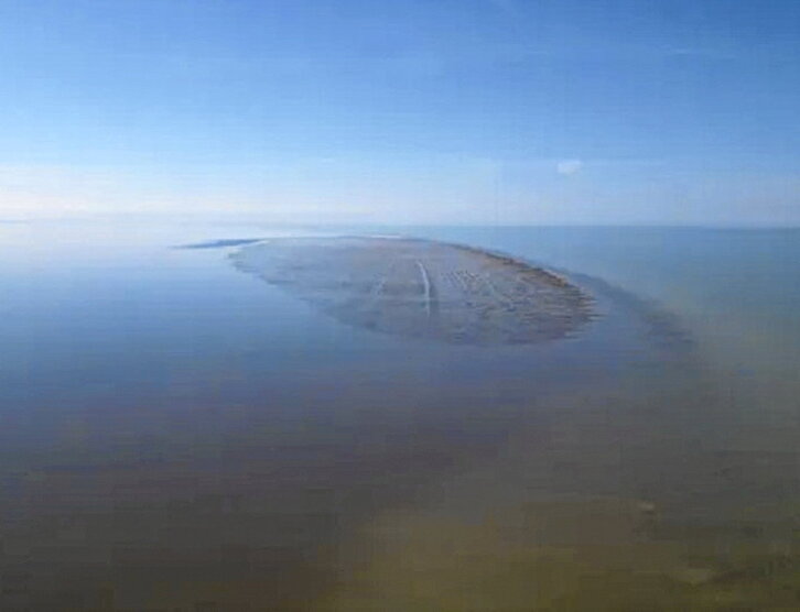 Satelite bidezko irudietan zantzuak ageri ziren arren, zientzialari errusiarrek ez dute aste honetara arte baieztatu Kaspiar itsasoan uharte berri bat azaleratu dela. Ezin izan dute lur berri honetan oinik jarri, eguraldiak eta uraren sakontasun ezak ez dutelako ahalbidetu, baina hegazkinez ateratako irudiak ez du zalantzarako tarterik uzten. Gizakiok eragindako klima krisiaren ondorioz, Kaspiar itsasoa elikatzen duten ibaien emaria gutxitu -Volgarena batik bat- eta itsasoaren maila beheititu da, eta horrek oraindik izenik ez duen uharte hau urgaineratu du. Lur berri bat, datorren mundu berriaren sinbolo.