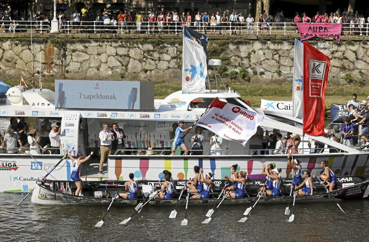 Eguraldi eguzkitsua, beroa, haize bizi samarra eta jaisten ari zen marea; hala hartu zuen atzo arratsaldean Bilboko itsasadarrak Euskotren eta Eusko Label ligen estreinaldia. Irabazleen izenek ez zuten inor harritu, Arraun Lagunak eta Orio, baina estropadek utzi zuten ezustekoren bat.