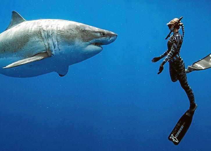 Marrazoen defendatzaile sutsua izanik eta animalia horien irudi publikoa aldatu nahirik, haiekin kaiolarik gabe igeri egiten hasi zen. Dokumentalak aurrez aurre izandako topaketen irudi ikusgarriak eskaintzen ditu; tentsioz eta edertasunez betetako uneak dira, edonor aho zabalik uzteko modukoak.