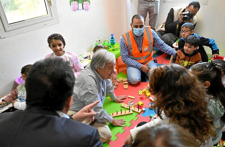 Imagen de archivo del secretario general de la ONU, António Guterres, visitando en un hospital de El Cairo a un grupo de niños palestinos evacuados desde la Franja de Gaza. (Mark GARTEN | ONU)