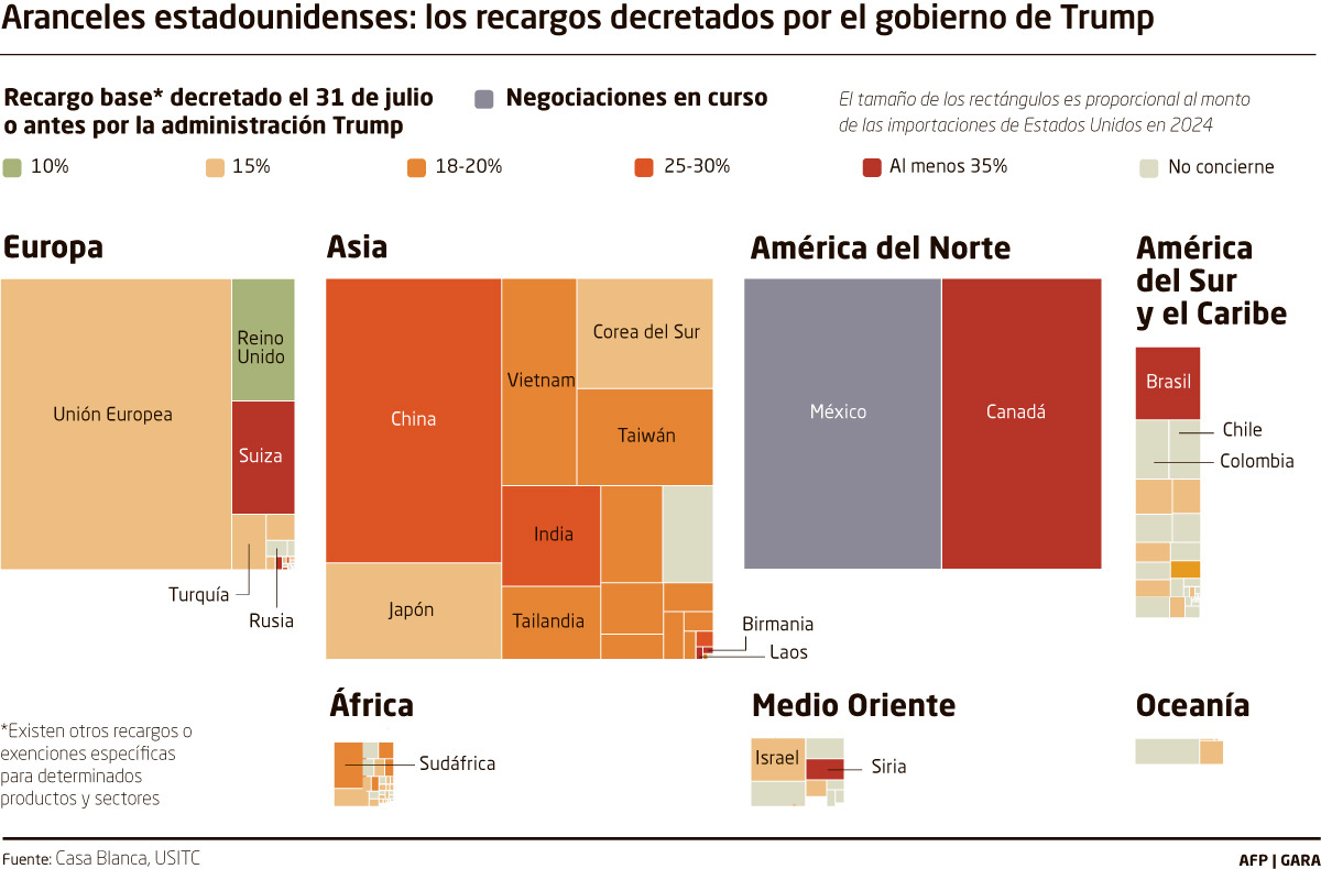 El presidente estadounidense, Donald Trump, anunció ayer la puesta en marcha de un nuevo plan arancelario que entrará en vigor a partir del 7 de agosto, seis días después de lo inicialmente previsto, y que impone un gravamen del 30% a aquellos países que no han alcanzado un acuerdo comercial con Washington a lo largo de estos pasados meses.