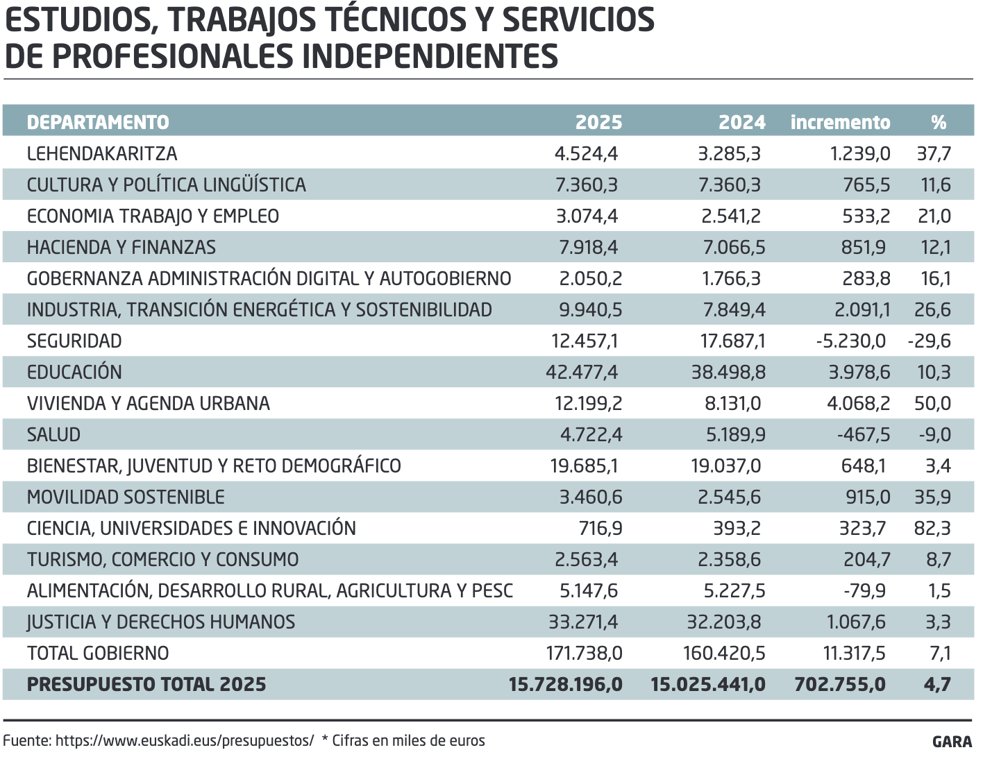 Ciencia, Universidades e Innovación prácticamente dobla la partida de 2024, y Vivienda y Agenda Urbana sube un 50%. La Consejería de Denis Itxaso ha llegado a contratar por 16.940 euros un estudio para saber si la reducción del 75% al 60% de la reserva para VPO, que ya se está tramitando en el Parlamento, será o no efectiva para «activar el fomento de la vivienda, tanto pública como privada».