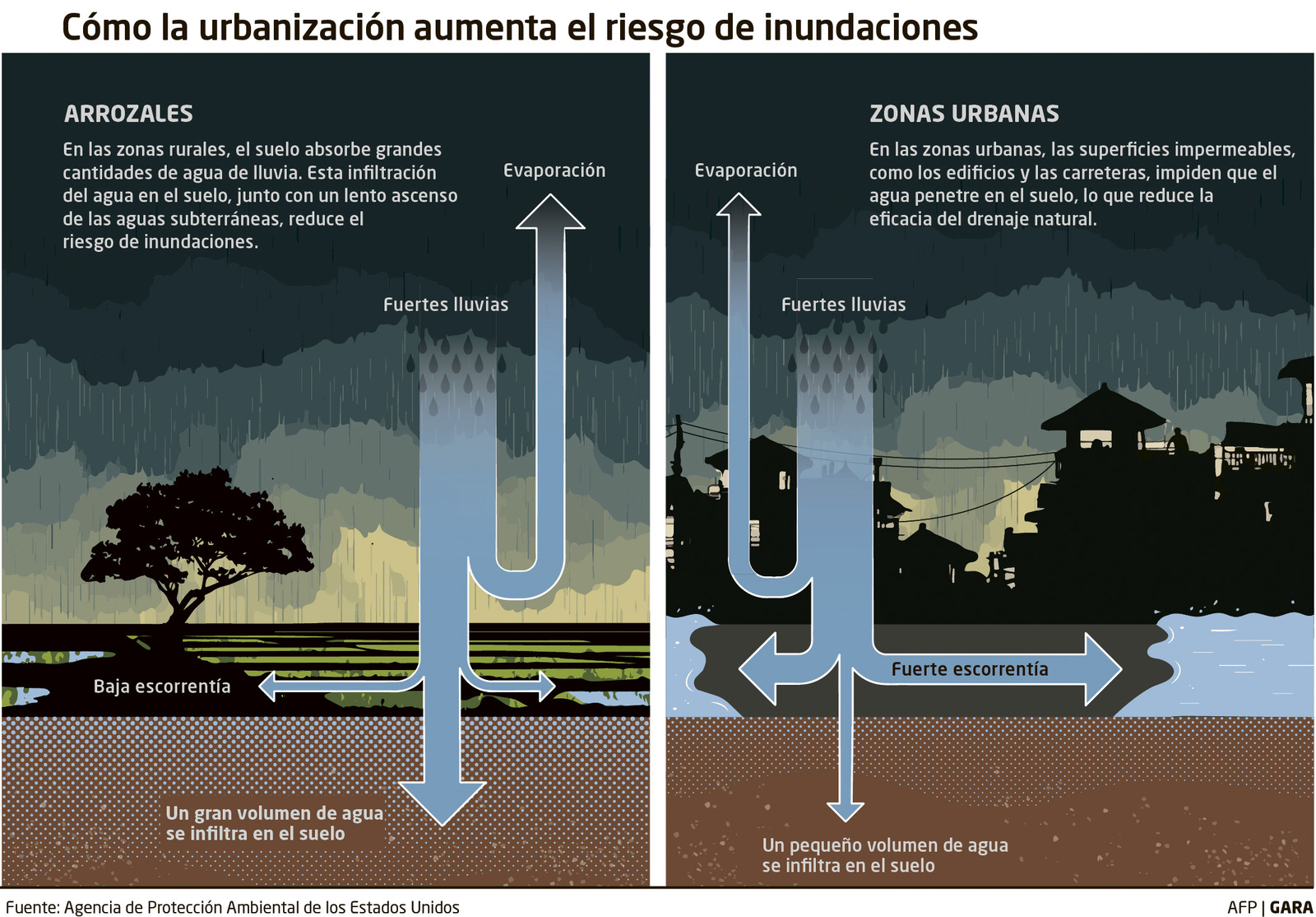 2025 URR. 27 El enorme coste del desarrollo turístico desenfrenado en Bali Las lluvias torrenciales que en septiembre arrasaron Bali y dejaron 18 muertos han puesto al descubierto el coste ambiental del turismo masivo. La urbanización descontrolada ha sellado el suelo y agravado las riadas, mientras la isla indonesia enfrenta una crisis de residuos y el riesgo de desastres mayores con el cambio climático. Marchio GORBIANO {{^data.noClicksRemaining}} Artikulu hau irakurtzeko erregistratu doan edo harpidetu Dagoeneko erregistratuta edo harpideduna? Saioa hasi ERREGISTRATU IRAKURTZEKO {{/data.noClicksRemaining}} {{#data.noClicksRemaining}} Klikik gabe gelditu zara Harpidetu {{/data.noClicksRemaining}} Ruth Deidree Boelan reza junto a la que era su casa en recuerdo de sus familiares muertos en unas recientes inundaciones en Bali, agravadas por el desarrollo turístico desenfrenado de esta isla indonesia. «Sigo en shock. Mi hermano, mi padre y mi madre fueron arrastrados por las aguas», declara a la agencia AFP esta joven de 28 años. Estas inundaciones y deslizamientos de tierra, provocados por lluvias torrenciales, dejaron 18 muertos en la “isla de los dioses” y pusieron de relieve el daño ambiental causado por años de desarrollo urbano y turismo desenfrenados. El auge turístico transformó el sur de la isla, otrora caracterizada por su verdor. Dio paso a la creación masiva de empleos, pero también impermeabilizó las tierras que antes proporcionaban drenaje. Al comparar imágenes del espionaje estadounidense desclasificadas de la Guerra Fría con fotos satelitales recientes, la startup TreeMap, a través de su proyecto Nusantara Atlas, visibilizó los drásticos cambios. «Todo este terreno se convirtió en carreteras o edificios; el suelo ya no tiene la misma capacidad para absorber agua», explica David Gaveau, su fundador. Más de 4,6 millones de extranjeros visitaron Bali en los primeros siete meses de 2025, una cifra superior a los 4,4 millones de residentes permanentes de la isla. La infraestructura para alojarlos provocó una «conversión de tierras y una gestión urbana caótica, acompañada de una aplicación laxa de las leyes de uso del suelo», denuncia Made Krisna Dinata, director ejecutivo de la ONG local Walhi Bali. Todo esto «dejó a Bali en una situación muy propensa a desastres», opina. PRECIPITACIONES RÉCORD Según datos de la agencia meteorológica local, Bali registró precipitaciones récord el 9 de septiembre, especialmente en el distrito de Badung, que alberga algunas de las atracciones turísticas más populares de la isla. El gobernador de Bali, Wayan Koster, asegura a AFP que «nunca se habían presentado lluvias tan intensas», pero concede que los problemas de infraestructura también influyeron en las desastrosas inundaciones. Las autoridades pondrán en marcha un estudio sobre las construcciones a lo largo de cuatro grandes cursos de agua, ha dicho, y ha prometido que «si se infringen las normas se tomarán medidas correctivas». También se prevén regulaciones para proteger las icónicas terrazas de arroz de Bali de un mayor desarrollo urbanístico. Además, la gestión de residuos supone un reto adicional. Según datos de 2019, Bali produce 4.200 toneladas de residuos al día, de las cuales menos de la mitad se envían a vertederos, según I Gede Hendrawan, profesor de la Universidad Udayana de Bali. Si no se tratan adecuadamente, esos residuos obstruyen ríos y alcantarillas, y agravan las inundaciones. Las autoridades balinesas se preparan este año para cerrar un importante vertedero en la isla e instan a los hogares a gestionar mejor sus residuos orgánicos. Sin embargo, Hendrawan lamenta que mucha basura corre el riesgo de acabar en la naturaleza, porque «falta un buen sistema de gestión de residuos». El Gobierno local trabaja con Yakarta para construir una planta incineradora, pero es poco probable que se materialice pronto, afirma Koster. También es posible que el volumen de residuos aumente si se concretan los planes de abrir un segundo aeropuerto internacional en el norte de la isla, lo que, según las autoridades, busca impulsar el turismo en esta zona menos visitada. El cambio climático también aumenta el temor a lluvias récord más frecuentes, ya que una atmósfera más cálida retiene más humedad. «Si no resolvemos este problema [de gestión de residuos], en diciembre y enero, cuando llegue la temporada de lluvias, podemos temer un desastre mayor», advierte Hendrawan. DESBOCADO Bali recibió más de 4,6 millones de turistas en solo siete meses de 2025, una cifra que ya supera a sus 4,4 millones de residentes permanentes.