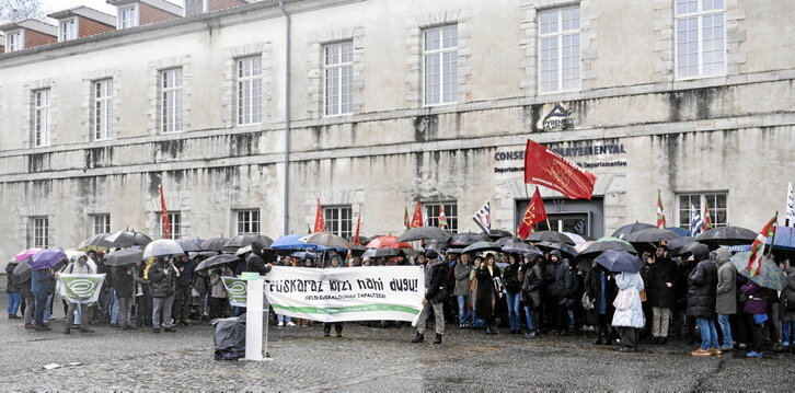 Pirinio Atlantikoetako Departamenduaren egoitzaren atarian mobilizazioa egin zuen atzo EHEk, Baionako eraikin horretan «Euskaraz bizi nahi dugu» leloa margotzeagatik lau kide epaituko dituztela-eta. Auzipetutako lagunei elkartasuna adieraztearekin batera, «egiturazko» bazterketaren aurrean euskaraz bizitzeko eskubidea aldarrikatu zuten protestan.