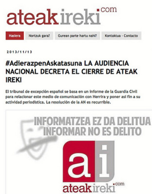 En un auto de apenas tres folios, el juez de la Audiencia Nacional española Eloy Velasco ordenó ayer el cierre de Ateak Ireki «para evitar la continuidad de la actividad ilegal de Herrira a favor de ETA». El equipo de Ateak Ireki denunció esta medida contra la libertad de expresión, comparándola con la Inquisición española. Sortu y EA también rechazaron el cierre y subrayaron la labor informativa desarrollada por el equipo de Ateak Ireki.
